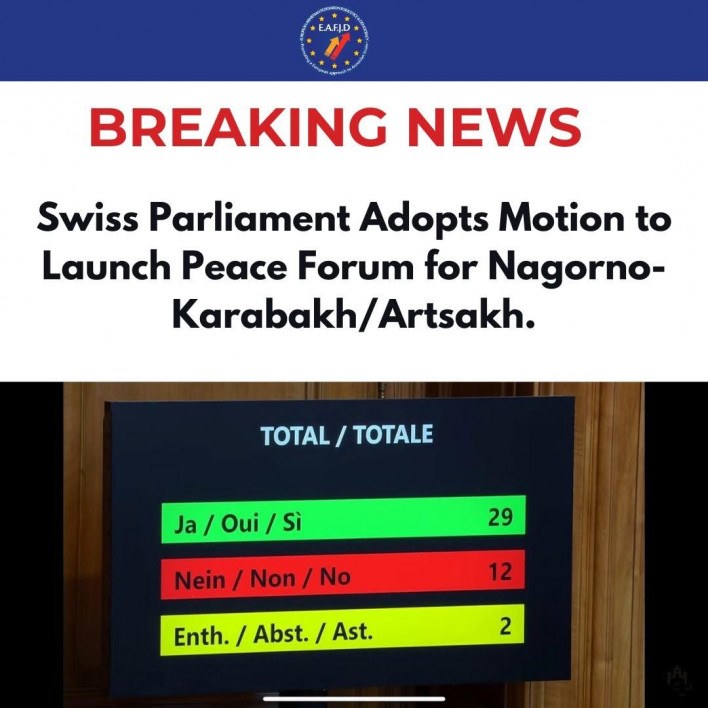 Դիվանագետների համահայկական խորհուրդը ողջունում է Շվեյցարիայի համադաշնության խորհրդարանի վերին պալատի՝ Կանտոնների խորհրդի կողմից «Լեռնային Ղարաբաղի համար խաղաղության ֆորում. հայերի վերադարձի հնարավորության ապահովում» անվանումը ստացած բանաձևի ընդունումը՝ որպես շարունակություն և ամփոփում 2024թ. դեկտեմբերի 17-ին Համադաշնության խորհրդարանի ստորին պալատի՝ Ազգային խորհրդի կողմից ընդունված նույն առաջարկի: